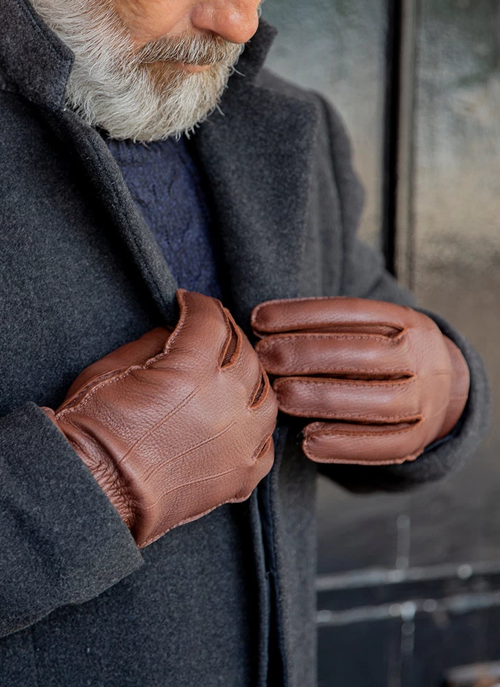 Enjoy the beautiful grain of deerskin leather paired with the luxurious softness of cashmere with our Chalford leather gloves. This classic glove is made from finest deerskin leather, noted for being strong, hard-wearing and handsome – the grain maturing with time to look better and better. This finest leather was handstitched with expert care, the design boasting classic three-point stitching for timeless style. Lined with super-soft cashmere for the ultimate in winter warmth, this must-have glove is available in three smart shades to coordinate with any look. A rugged favourite certain to impress for years to come.
