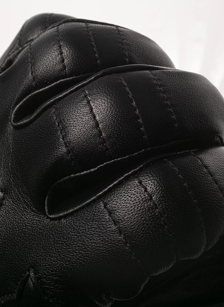 - Padded cross-shaped knuckles and stitch detailing on fingers offer a modern edge
