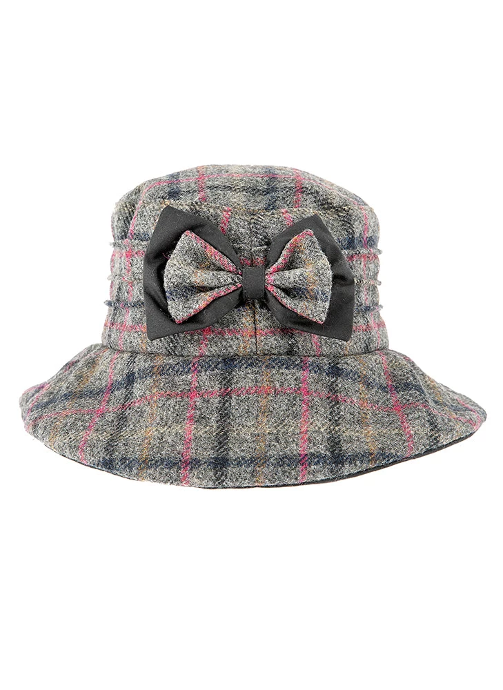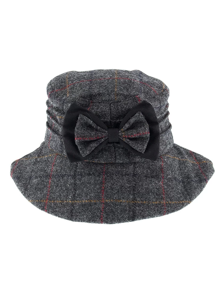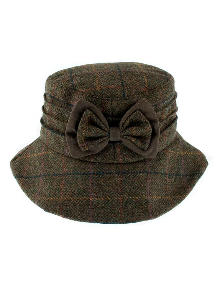 A classic tweed hat finished with a feminine bow, perfect for countryside attire.