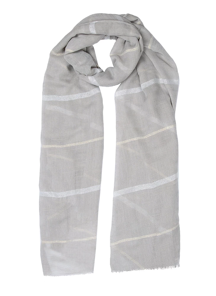 Set your spring wardrobe to sparkle thanks to our lightweight scarf. Designed with horizontal stripes woven from metallic thread, the scarf delights in finer details. The shiny stripes alternate in colour and thickness, the silver ones twice the thickness of the contrasting gold, while there are long, raw ends for a casual, carefree feel. Offered in cool dove grey, this summer scarf adds understated elegance to both daytime and evening looks.