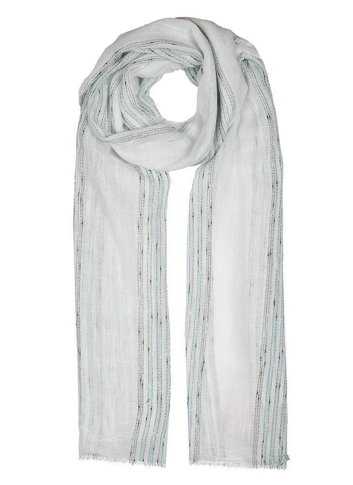 Enjoy understated everyday elegance thanks to our striped summer scarf. This lightweight scarf boasts a subtle dash-stripe pattern in cool mint and black, adding refined colour to the white fabric. Complete with raw edges and a textural feel, the whole look is laidback and relaxed â perfect for weekend unwinding.