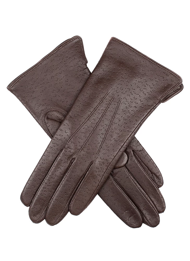 - Three-point decorative stitching on the back of the gloves elongates the look of the hand for a refined appearance