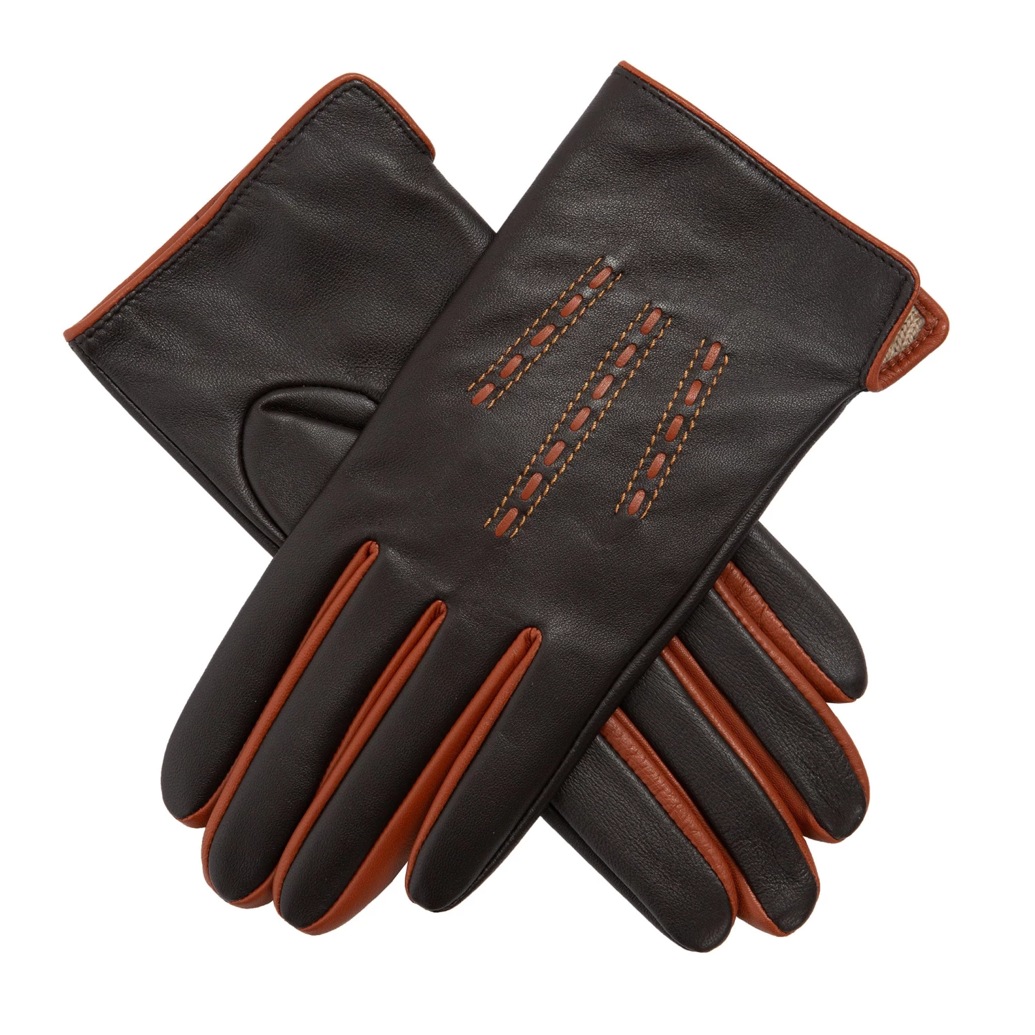 Combine classic cool with dramatic colour thanks to our Penelope leather gloves. Rich chocolate brown is given an unexpected edge with eye-catching cognac piping and stitching. Made from finest hairsheep leather and finished with a cosy knitted lining, these fashion-forward gloves are stylish, sleek and sophisticated.
